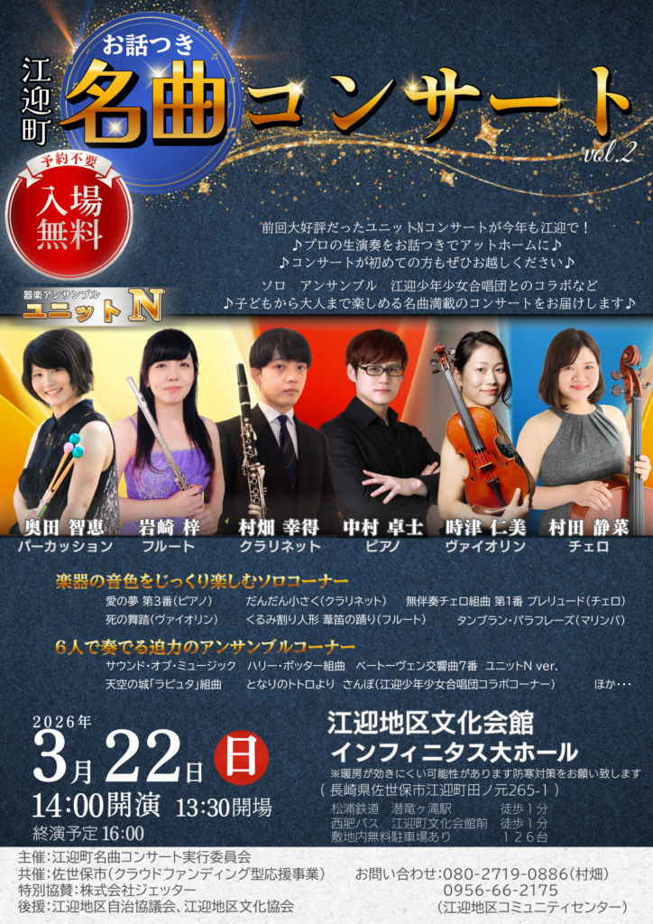 プロ演奏家による無料のコンサートが佐世保市江迎町で開催!