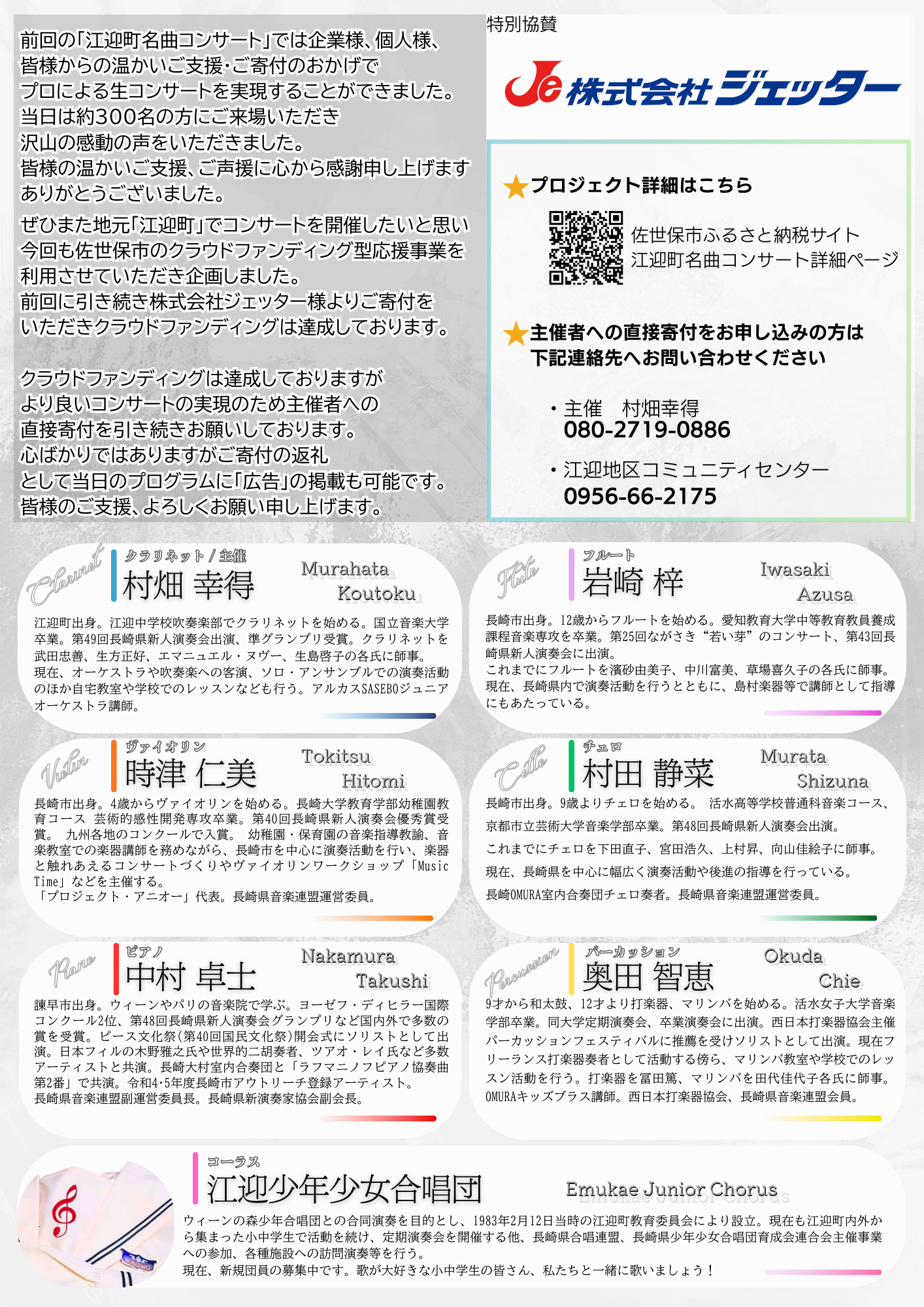 前半はどこかで聞いたことがあるクラシックやそれぞれの楽器の良さが発揮されるソロ曲をお届けします。オーケストラや吹奏楽の大人数ではなかなか聞けない各楽器の音色をソロでお楽しみください。そして江迎少年少女合唱団との楽しいコラボも予定しております。